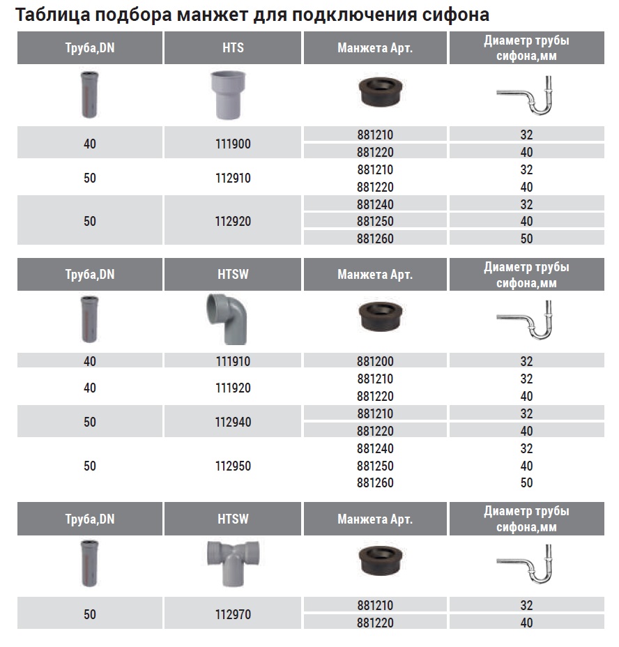 Условные диаметры: 32, 40, 50, 75, 90, 110, 125, 160 мм.