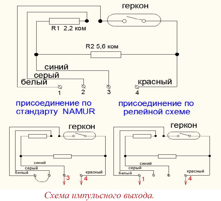 Импульсный выход решен по 4-х проводной схеме (см.рис.), что позволяет подключать счетчик как к обычным релейным считывающим устройствам, так и к устройствам, поддерживающих стандарт NAMUR (DIN EN 50227, DIN 192234). Стандарт NAMUR предусматривает возможностью контроля считывающим устройством обрыва провода и короткого замыкания. Для этого в цепь геркона включены два дополнительных сопротивления.