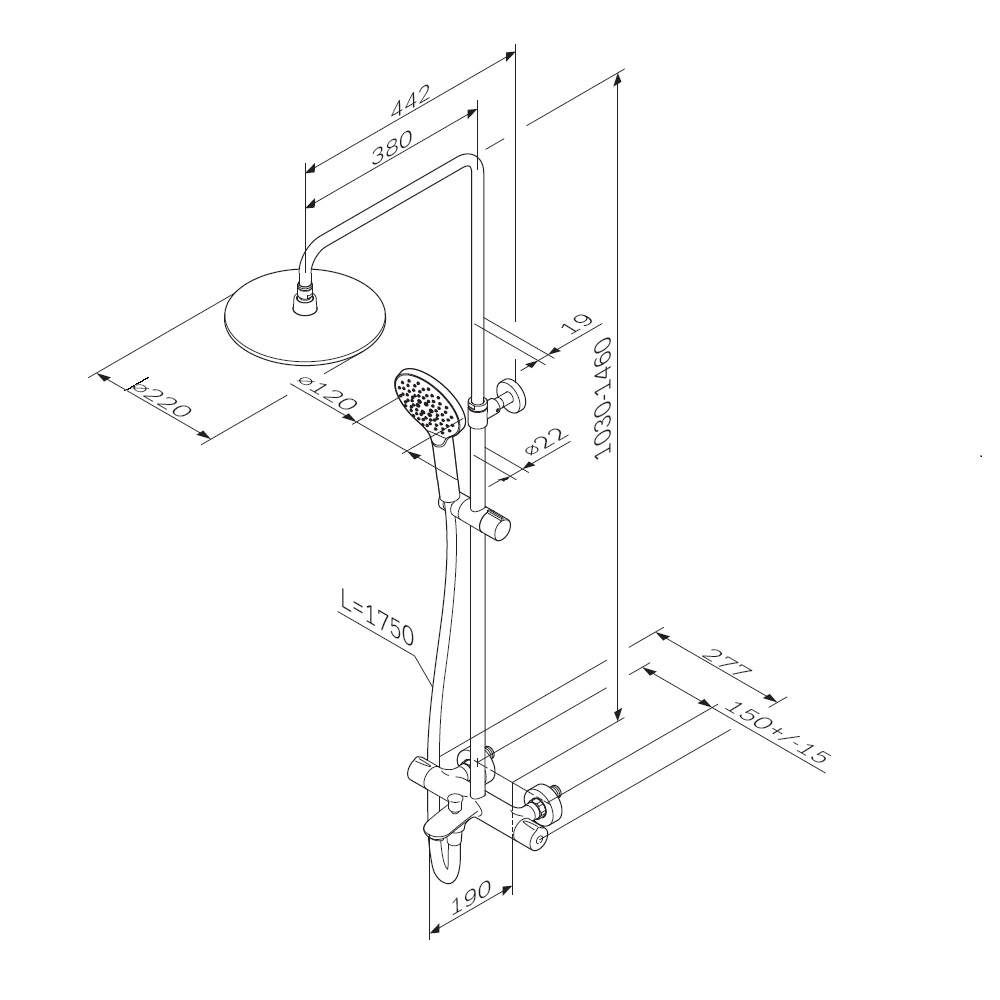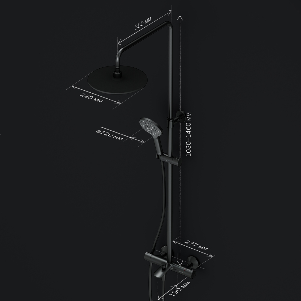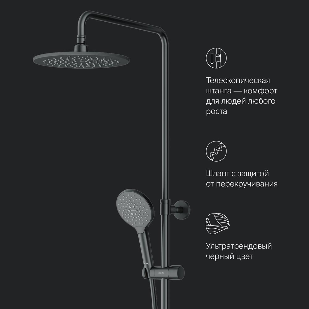 Продуманные детали для удобства использования: штанга регулируется по высоте в диапазоне от 1030 до 1460 мм обеспечивая комфорт для людей любого роста шаровый шарнир в держателе верхнего душа позволяет регулировать угол его наклона душевой шланг 1750 мм верхний душ диаметром 220 мм ручной душ диаметром 120 мм.