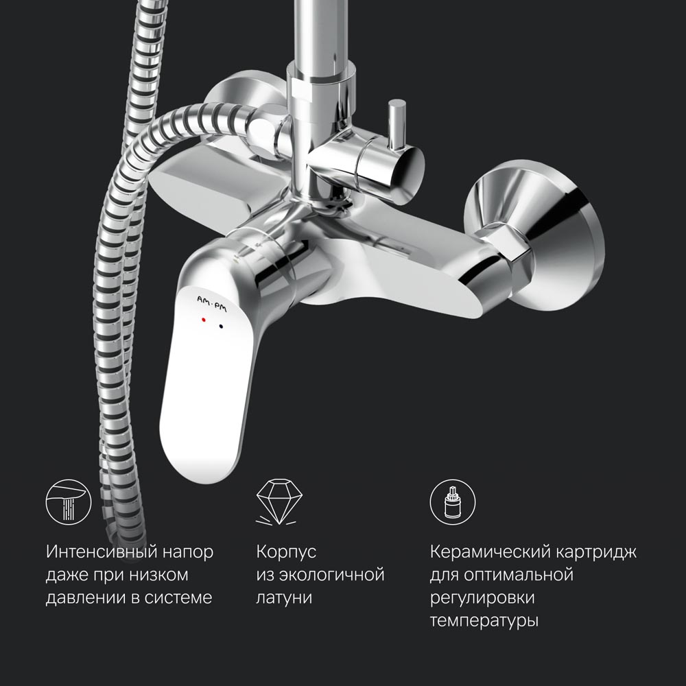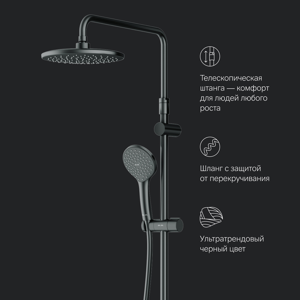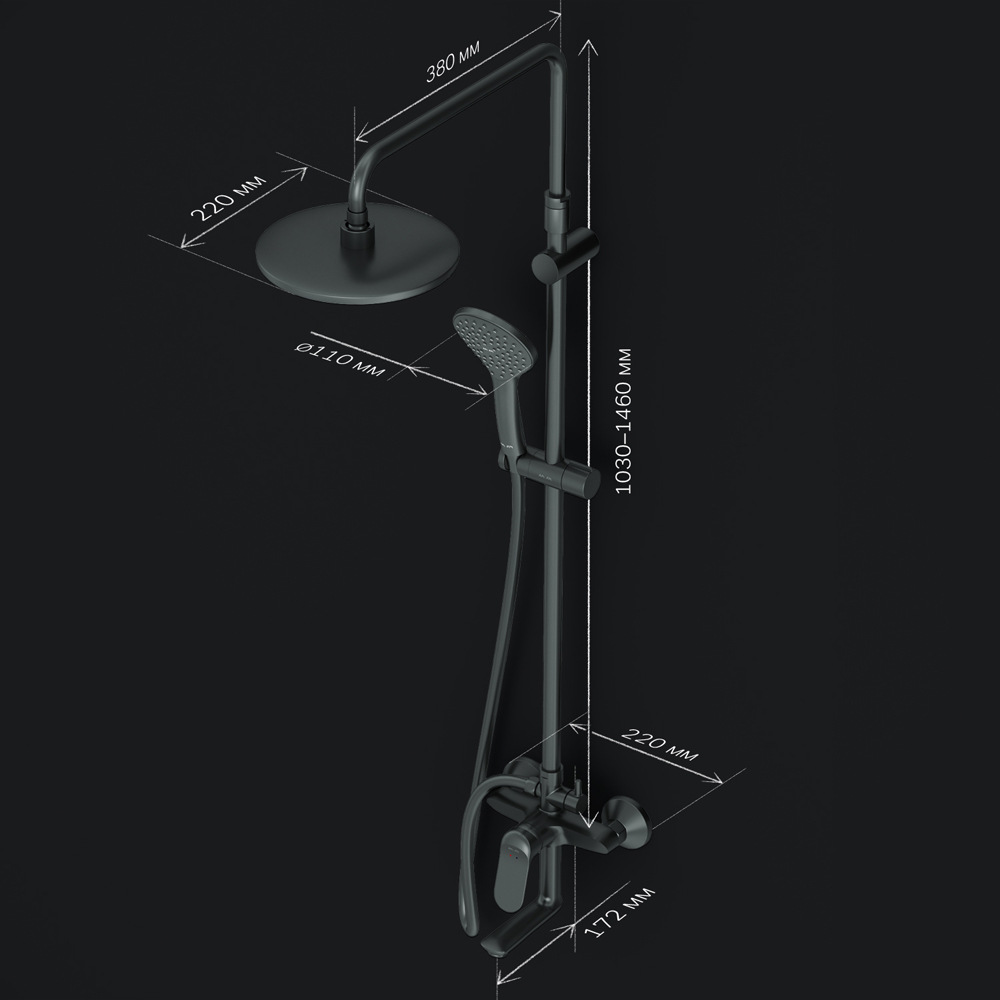 Диаметр душевых леек (верхний душ 220 мм и ручной душ 110 мм) позволит ощутить преимущества тропического душа даже в стандартной ванной тогда как увеличенная длина шланга 1750 мм обеспечит свободу движений во время принятия душа. Продуманные детали для удобства использования: телескопическая поворотная штанга регулируется по высоте в диапазоне от 1030 до 1460 мм обеспечивая комфорт для людей любого роста.