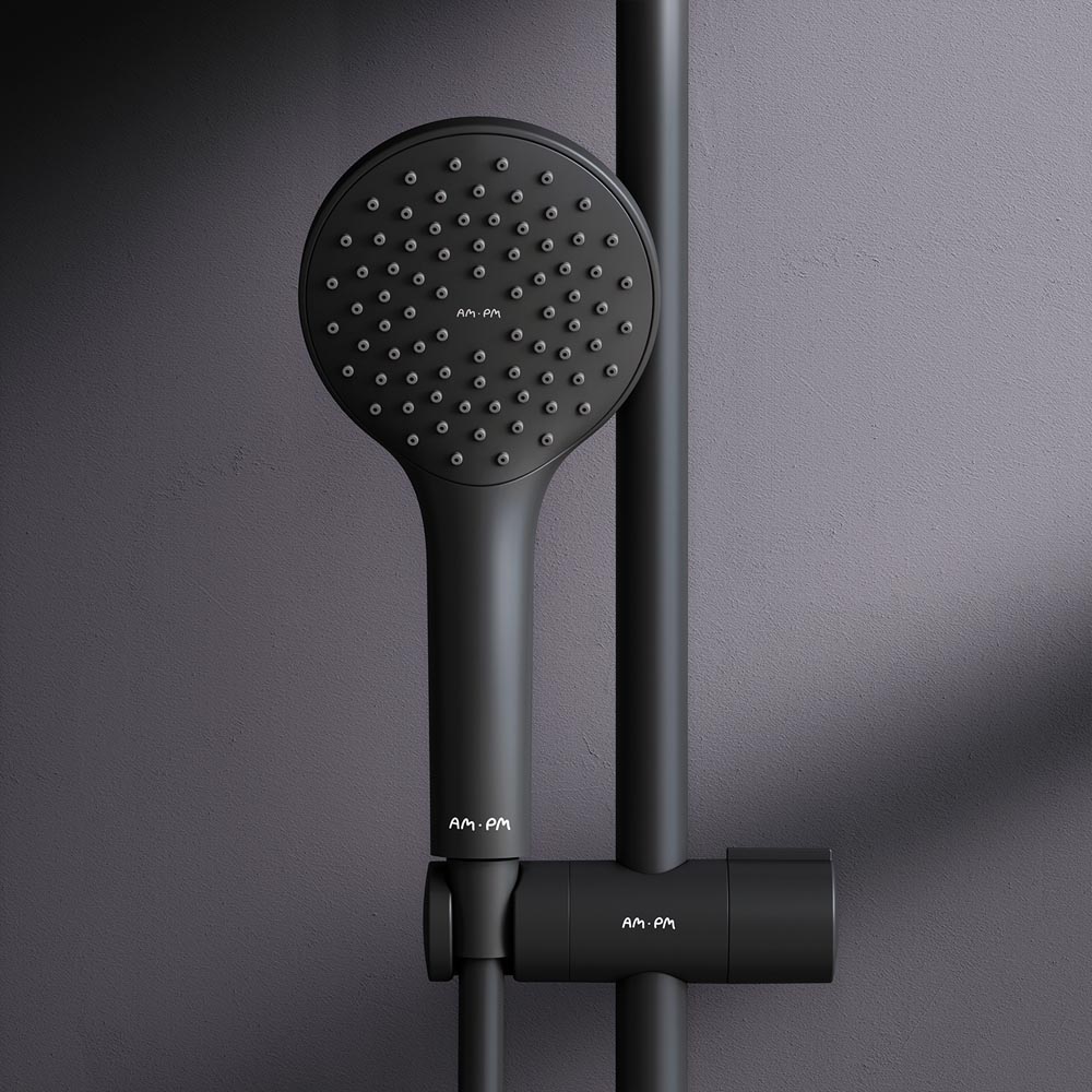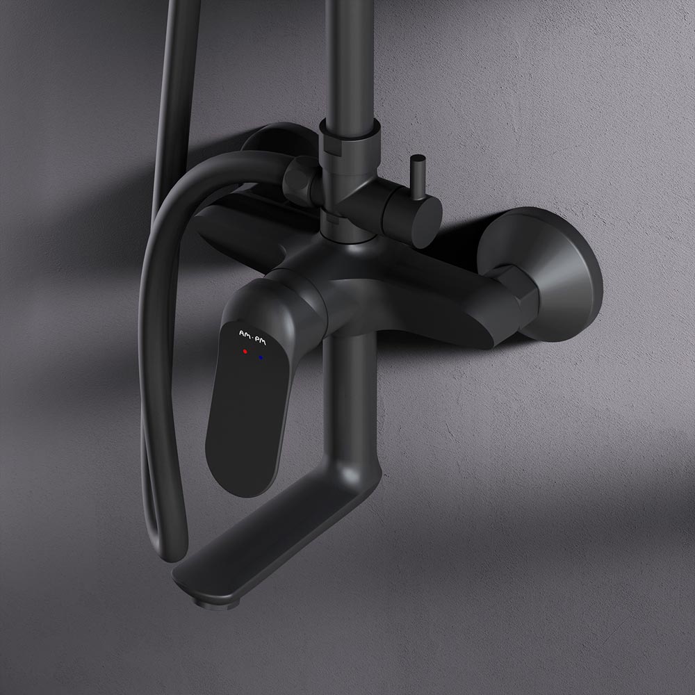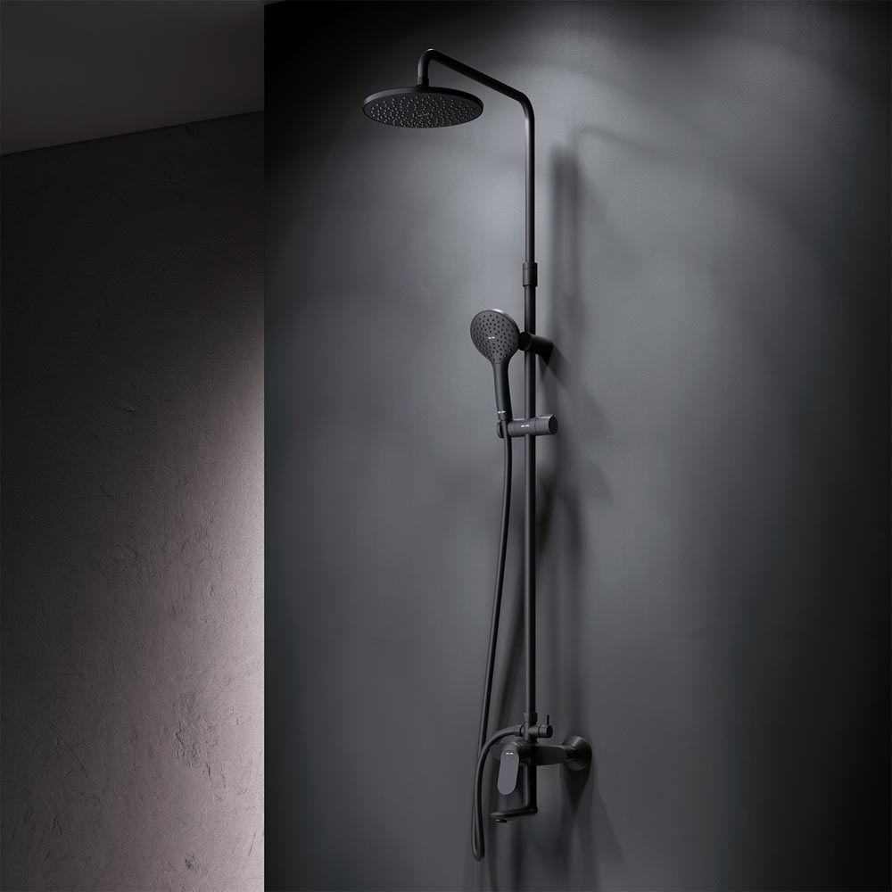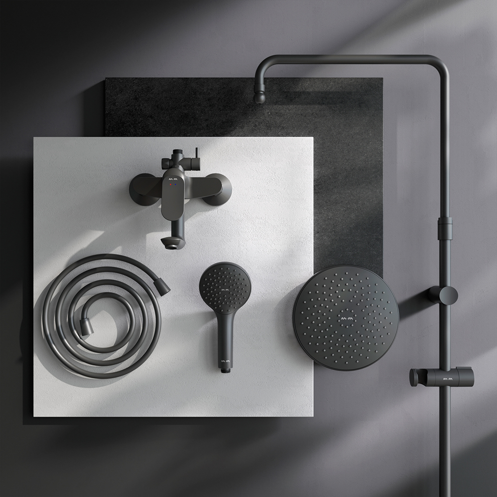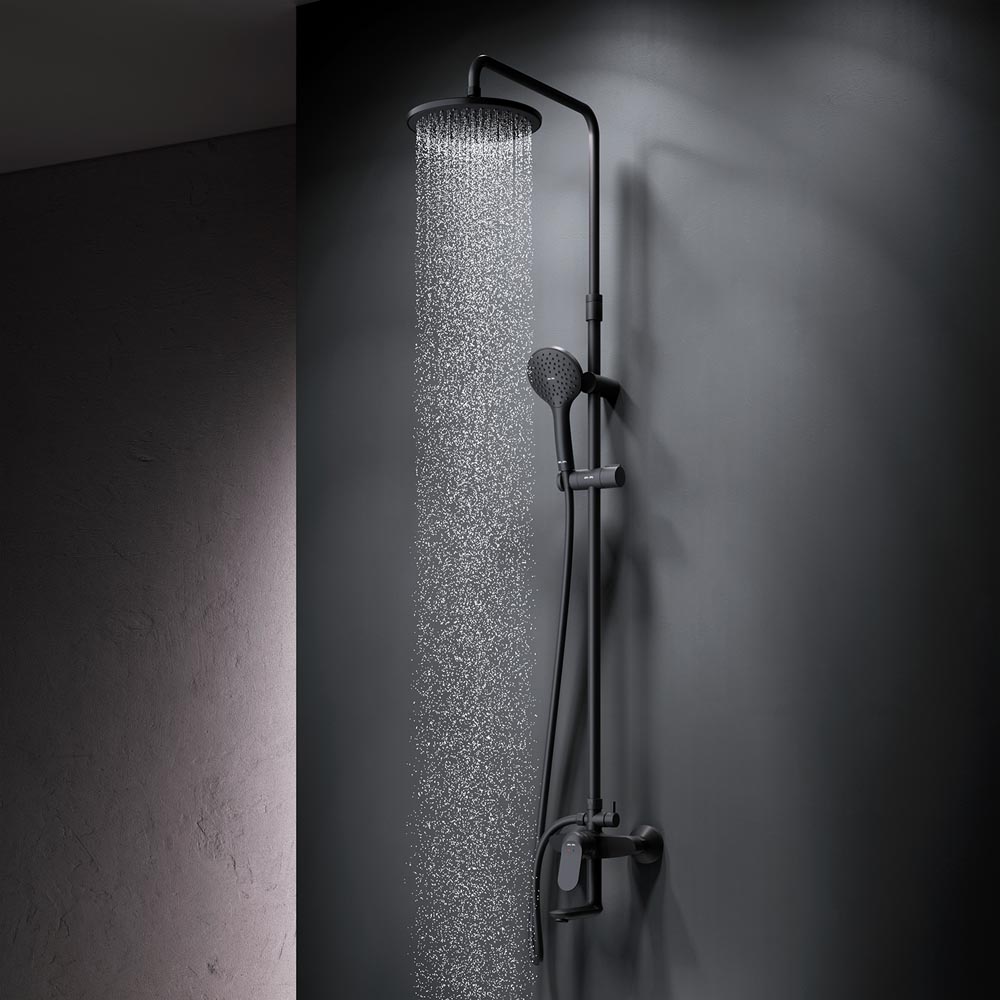 Черный цвет как нельзя лучше подчеркивает изящество силуэтов смесителя и душевой системы добавляя роскошь интерьеру ванной комнаты.