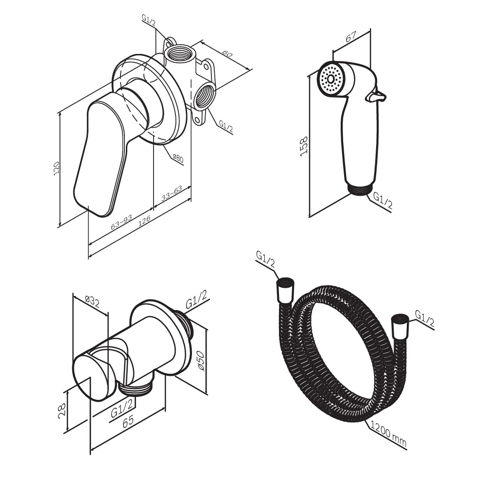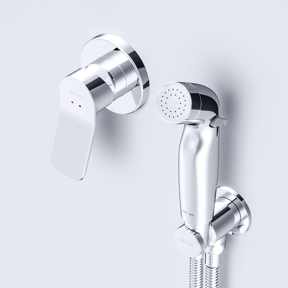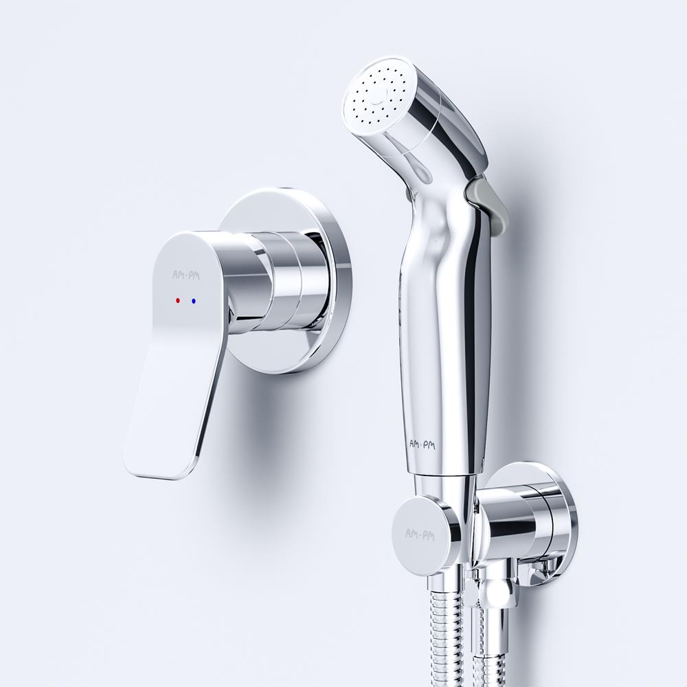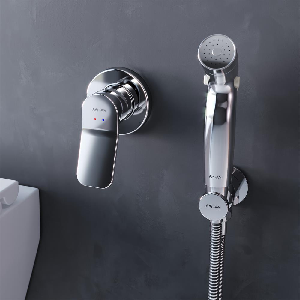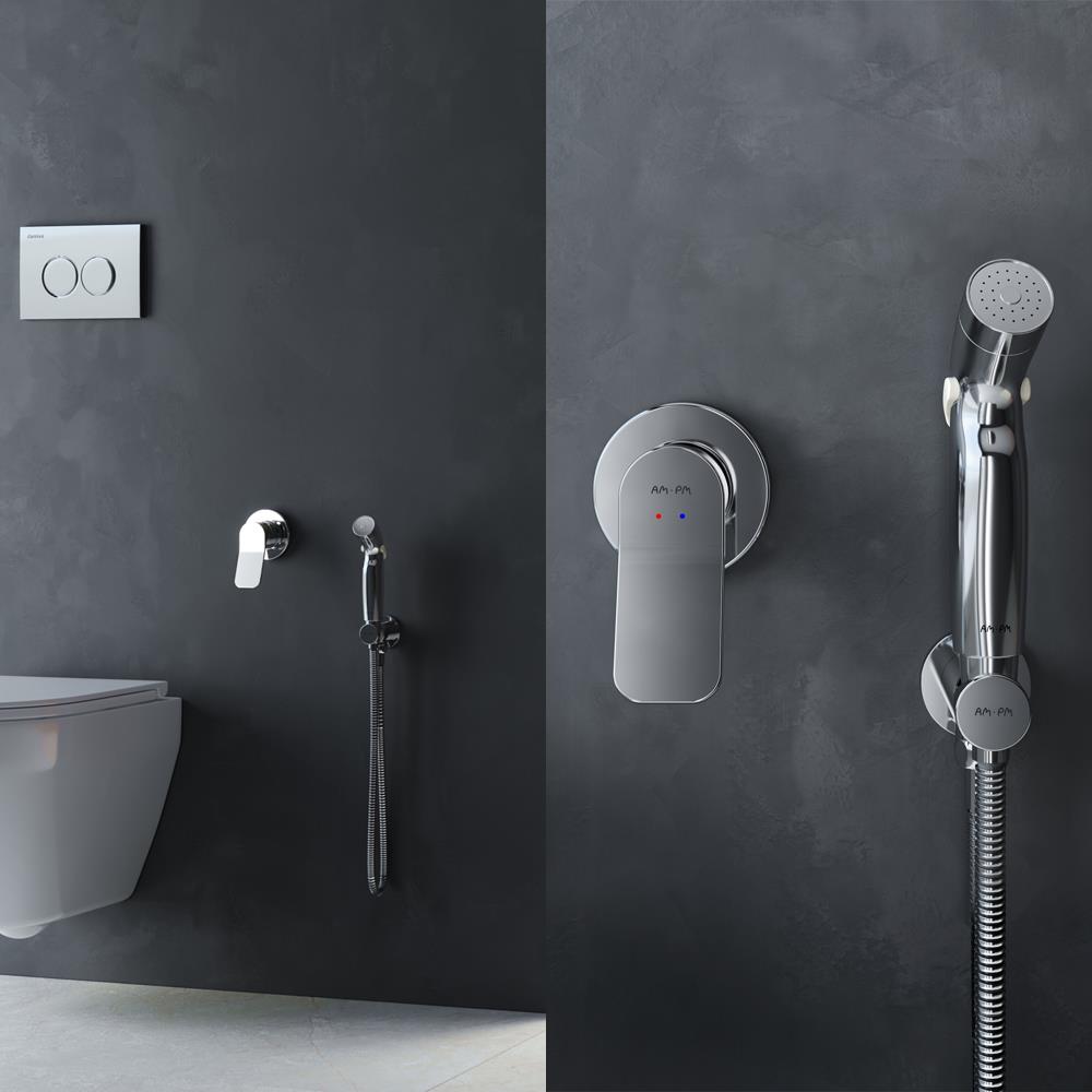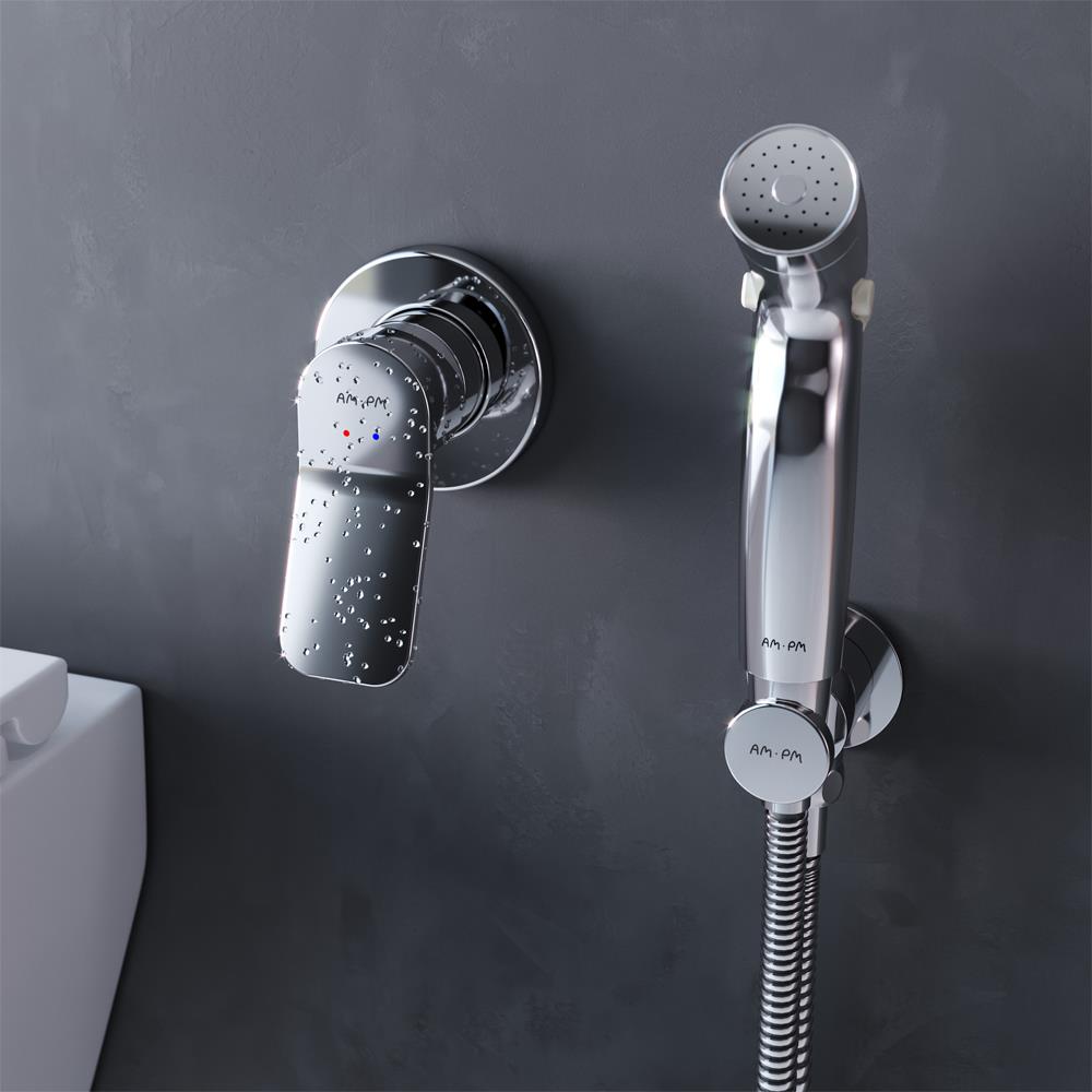 Готовое решение X-Joy включает в себя стильный смеситель для душа монтируемый в стену шланговое присоединение с боковым расположением держателя для гигиенической лейки гигиеническую лейку и душевой шланг длиной 1200 мм.