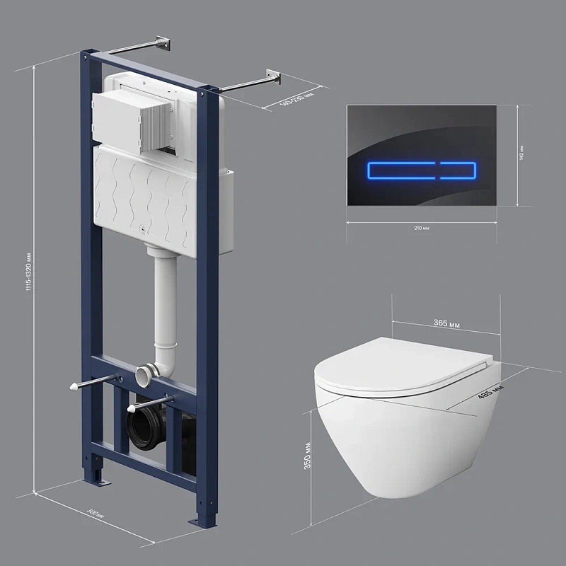 Не разборная рама из стального профиля выдерживает нагрузку до 400 кг. Полностью изолированный бачок с качественной двухрежимной смывной арматурой - комфортное использование благодаря низкому уровню шума - менее 20 Дб. Укомплектован сенсорной клавишей в черном цвете. В комплекте все необходимые патрубки и крепления а также прокладка между унитазом и стеной - звукоизоляция.